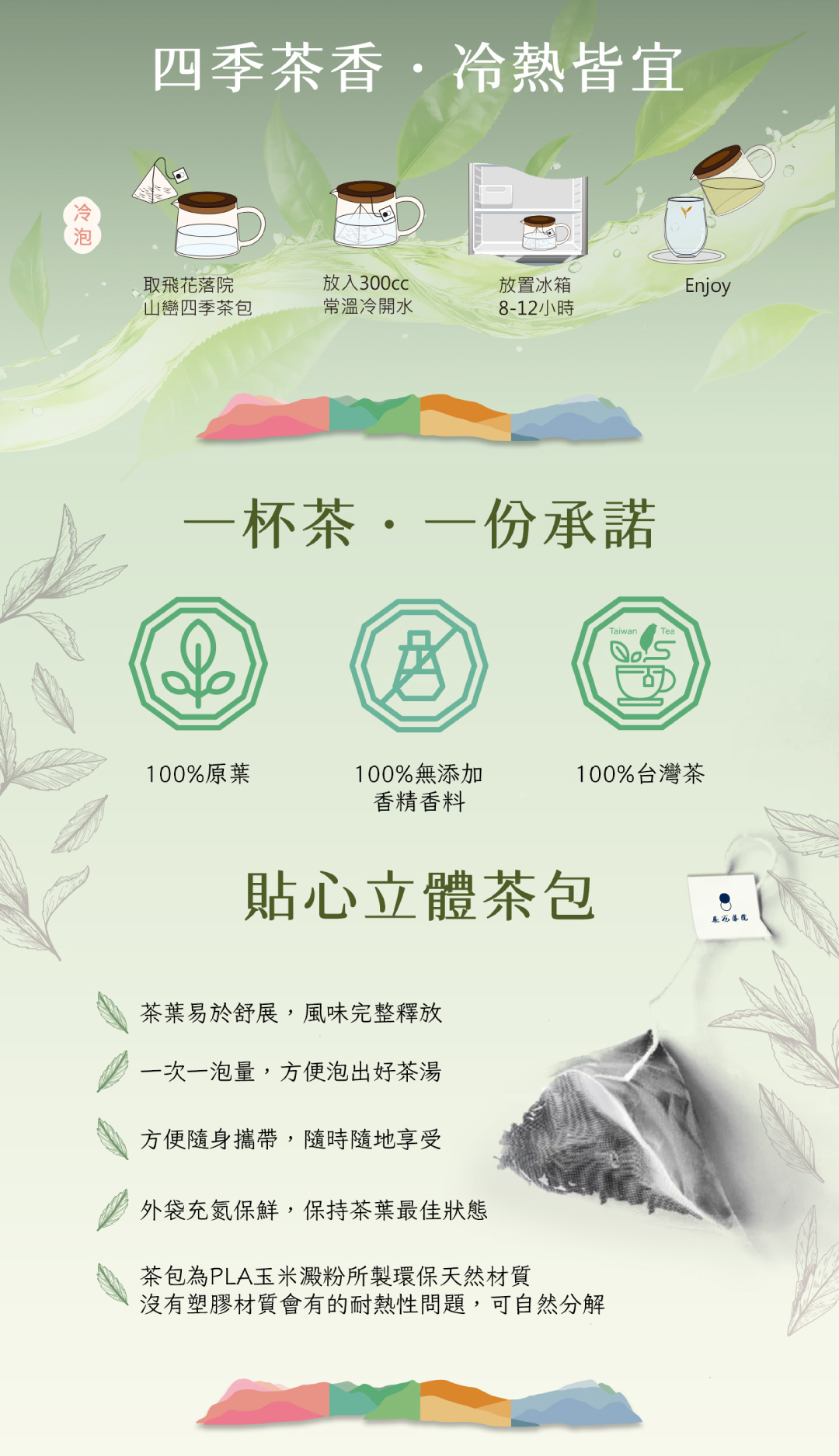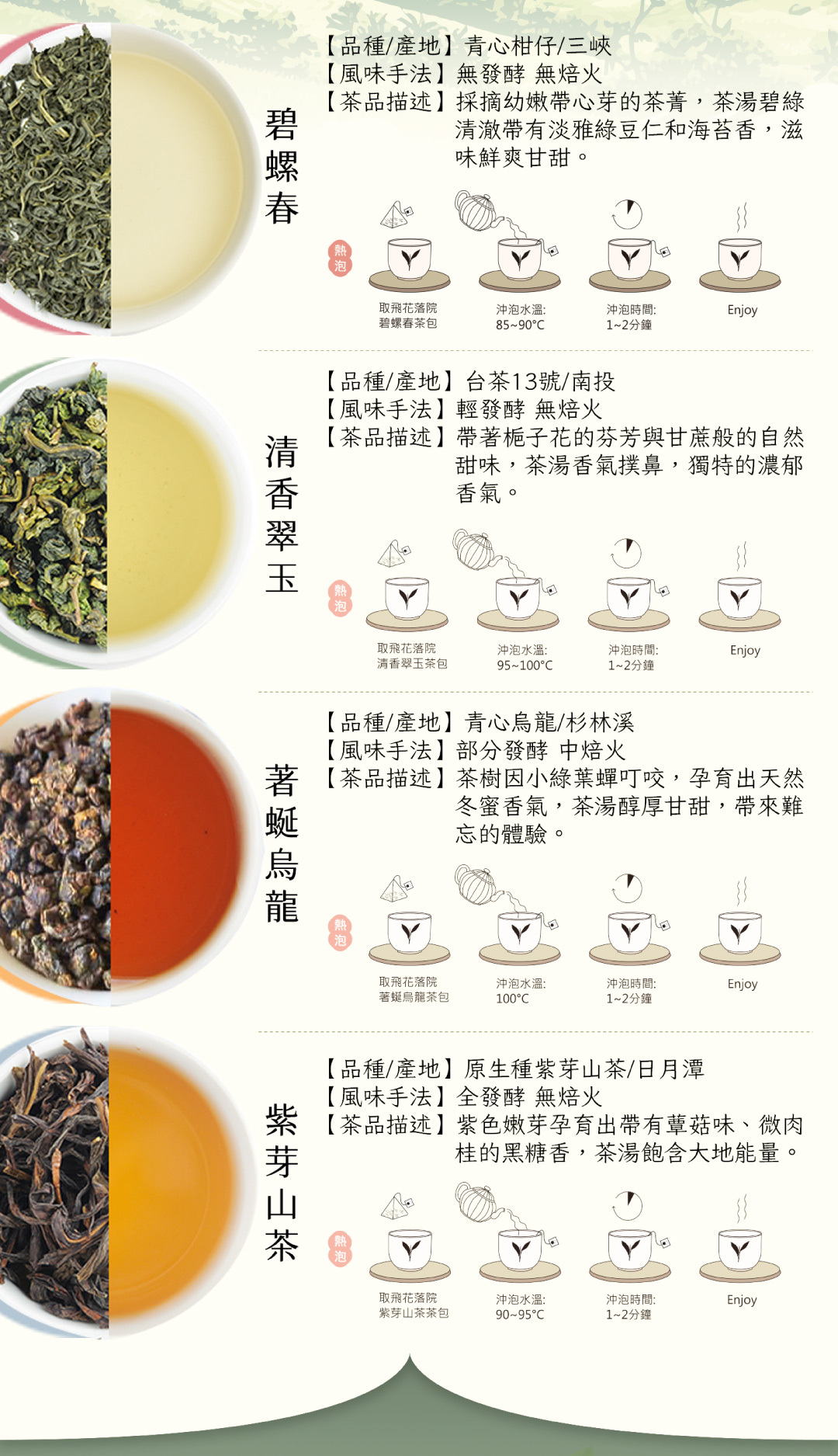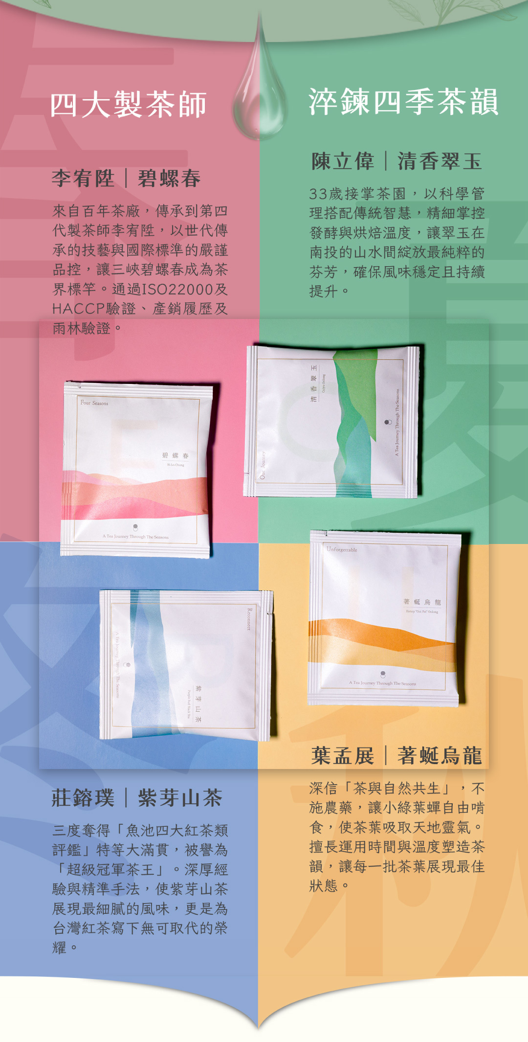 從三峽碧螺春的春日清新,到南投翠玉的夏日芬芳,從杉林溪著蜒烏龍的秋日溫潤,到日月潭紫芽山茶的冬日醇厚,